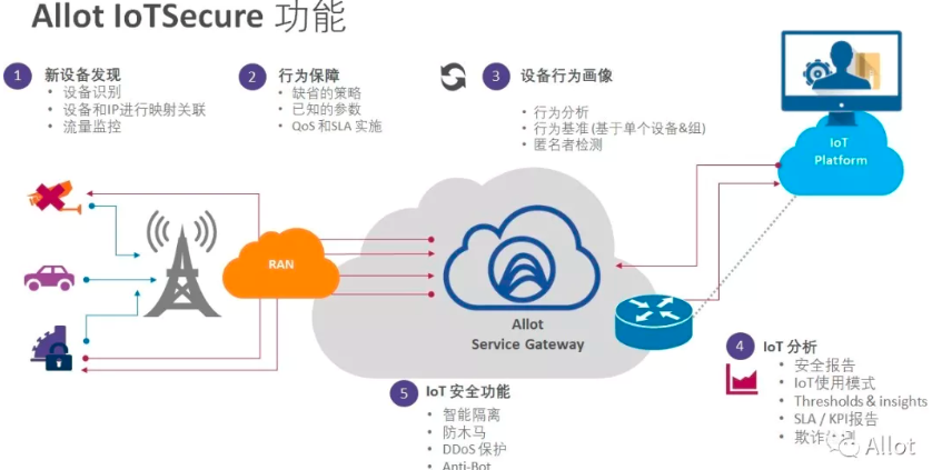 物联网部署通常服务于特定或有限的一组功能,并且它们直接与一组有限的管理服务器和服务进行通信。 AUP的目标是通过源,应用和行为来监控通信,以减少设备的攻击面。Allot Secure Service Gateway使企业能够定义可接受的使用策略,以控制对IoT设备的访问,并监控物联网设备与授权服务器之间的通信通道。挑战在于大规模提供细粒度访问控制和流量监管。全球部署在运营商网络,数据中心和企业网络中的Allot多业务平台可以监控数百万个流量,并具有最大的物联网部署所需的规模和稳健性。