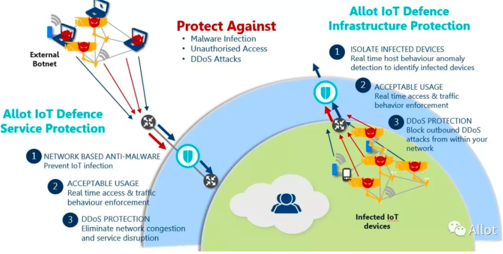 Allot IoT Defense(AID)使企业能够在网络层保护物联网部署,解决两个主要问题: